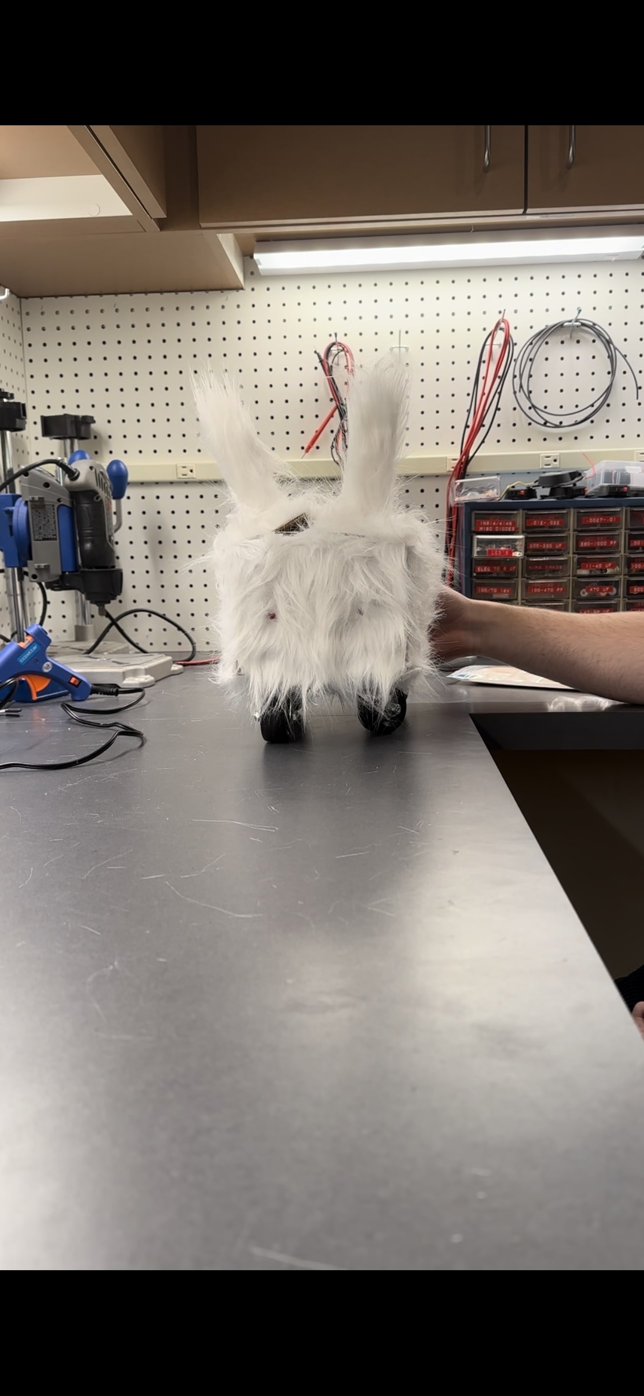 This is Bucket, the shrieking bunny-sizer. If you put him in the dark or stroke his forehead, his inner oscillator circuit fires, crying tears of fear. We programmed bucket's oscillator program using Max/gen~ and flashed it to the daisy via Oopsy. The parameters of the oscillator are controlled using three potentiometers and a photosensor. The photosensor can be controlled by the lights or by a player's hand like a theremin. When there is little light, the bunny becomes audible and the potentiometers can be used to manipulate the bunny's timbre.